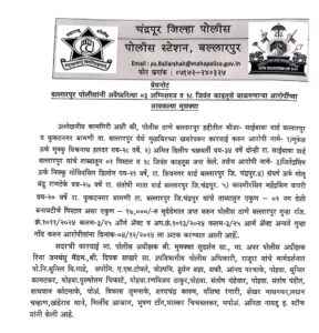 उपरोक्त कारवाई जिला पुलिस अधीक्षक सुदर्शन मुमक्का, अति. पुलिस अधीक्षक रीना जनबन्धु, एसडीपीओ दीपक साखरे, के मार्गदर्शन में पुलिस निरीक्षक सुनील गाडे एपीआई ए एस टोपले, पीएसआई हुसैन शाह, ए एसआई आनंद परचाके, सुनिल कामटकर, पुरुषोत्तम चिकाटे, रणविजय ठाकुर,संतोष दंडेवार, संतोष पंडित,सत्यवान कोट,विकास जुमनाके, शरदचंद्र कारूश, वशिष्ठ रंगारी,शेखर माथनकर,लखन चव्हाण,खांडेराव माने,,मिलिंद आत्राम,भूषण टोंगे,भास्कर चिचवलकर , अनीता नायडू, आदि ने की है.