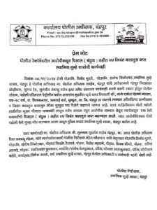*सदर माहिती श्री महेशजी कोंडावार साहेब पोलीस निरीक्षक,स्थानिक, गुन्हे शाखा, चंद्रपुर यांनी प्रेस नोट द्वारे दिली आहे*