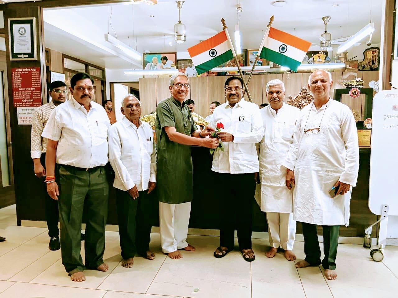 लोकतंत्र सेनानींना मानधन मिळण्यात व इतर प्रशासकीय बाबींमध्ये येत असलेल्या अडचणींचे निवेदन मुख्यमंत्री श्री. देवेंद्र फडणवीस यांना दिल्याबद्दल कृतज्ञता व्यक्त करण्यासाठी संघटनेच्या शिष्टमंडळाने आ. श्री. मुनगंटीवार यांची अलीकडेच प्रत्यक्ष भेट घेतली. लोकतंत्र सेनानी संघाचे (जालना, परतूर) कार्याध्यक्ष रघुनाथ दीक्षित, महासचिव विश्वास कुलकर्णी (जळगाव), प्रदीप ओगले (सांगली), अरुण भिसे (यवतमाळ), पांडुरंग जिंजुर्डे (यवतमाळ) आणि यादवराव गहूकार (यवतमाळ) यांनी आ. श्री. मुनगंटीवार यांची भेट घेतली.