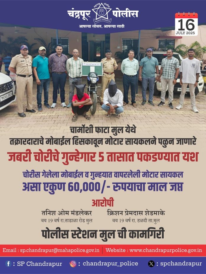 १५ जुलै रोजी रात्री ९ वाजताच्या सुमारास एकारा येथील रहिवासी विवेक पांडुरंग कोटनाके (वय ३१) हे मौजा चार्मोशी फाटा-मुल रोडवरून जात असताना, मोटारसायकल (क्रमांक MH34-T-561) वरून आलेल्या दोन युवकांनी त्यांच्या हातातील मोबाईल जबरदस्तीने हिसकावून पळ काढला. यासंदर्भात मुल पोलीस स्टेशन येथे भादंवि कलम ३०४, ३(५) भारतीय न्याय संहिता – २०२३ अन्वये गुन्हा क्रमांक २५५/२०२५ नोंदविण्यात आला.