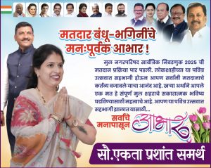 *मूल नगर परिषद के चुनाव में नगराध्यक्ष पद पर कांग्रेस की एकता प्रशांत समर्थ ने और नगरपरिषद के 18 अठारह नगरसेवक के पदोंपर काँग्रेस उम्मीदवारोने परचम लहराया*