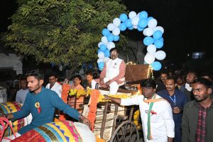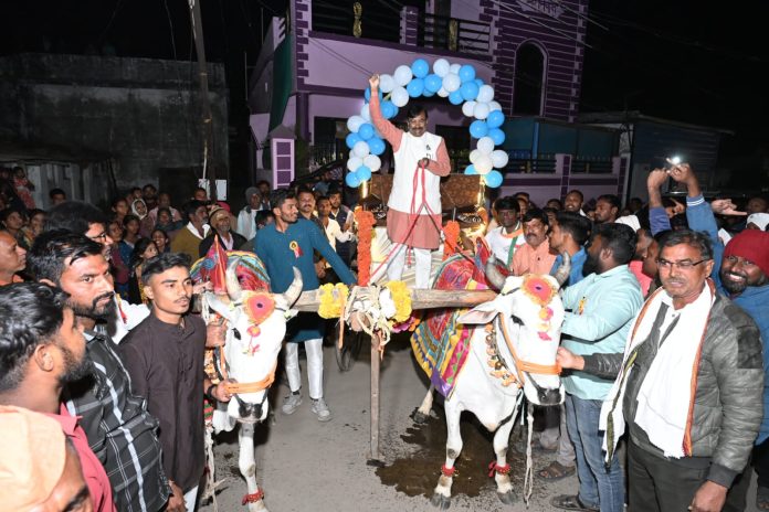 आ. मुनगंटीवार यांची बैलबंडीवर मिरवणूक आणि लाडू तुला