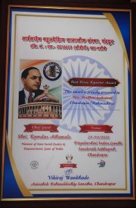 सामाजिक न्याय राज्यमंत्री रामदास आठवले यांचे हस्ते कु. माधुरी कटकोजवार यांना बेस्ट प्रेस रिपोर्टर अवार्ड प्रदान आईसाहेब बहुउद्देशीय सामाजिक संस्था चंद्रपूरच्या वतीने दि.21 मार्च 2026 ला सायंकाळी 7 वाजता स्थानिक प्रियदर्शिनी इंदिरा गांधी सभागृहाच्या भव्य मंचावर शेकडो चंद्रपूरकरांच्या साक्षिने भारत सरकारच्या सामाजिक न्याय खात्याचे केंद्रीय राज्यमंत्री नामदार मा. रामदास आठवले साहेब यांच्या शुभहस्ते चंद्रपूर येथील जर्नलिस्ट कु. माधुरी कटकोजवार (मास्टर ऑफ मास कम्युनिकेशन तथा एम.ए. हिंदी गोल्ड मेड्यालीस्ट) यांना “बेस्ट प्रेस रिपोर्टर अवार्ड” प्रदान करुन गौरविण्यात आले आहे. यावेळी मंचावर रिपब्लिकन पार्टी ऑफ इंडिया (आठवले) चे विदर्भ अध्यक्ष अरुण घोटेकर, जिल्हाध्यक्ष गौतम तोडे, रिपब्लिकन पार्टी ऑफ इंडिया (आंबेडकर) जिल्हाध्यक्षा प्रियाताई खाडे, आईसाहेब बहुउद्देशीय सामाजिक संस्थेचे अध्यक्ष विक्कीराज वानखेडे , प्रभाकरराव खाडे, डॉ.आकाश जिवाने, सुनिल रामटेके, योगेश रायपुरे, ज्ञानेश्वर नगराळे, विवेक खाडे, संघर्ष उपरे, आशिष ताजने आदि मान्यवरांची उपस्थिती होती.
