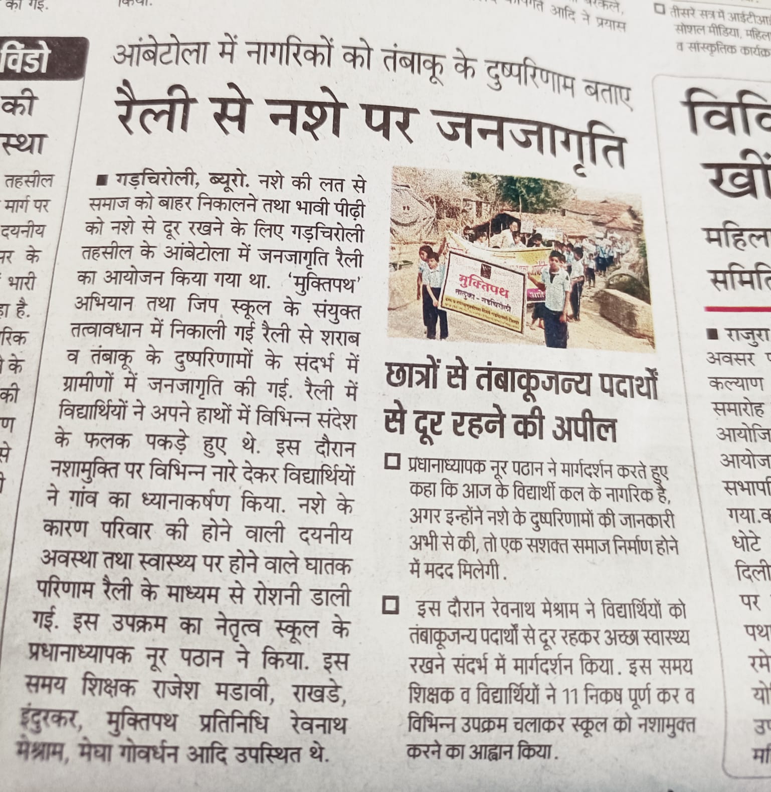 तंबाकू जन्य पदार्थोसे छात्रोंको दूर रहने के लिये रैलियों के जरिये गडचिरोली के आंबेटोला गाँव मे जिला परिषद स्कूलों के शिक्षकोने शराब और तंबाकू के दुष्परिणामो के बारेमे विद्यार्थियोंमे जनजागृति कर रहे है !